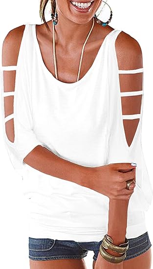 - Scoop neck, cut out open shoulder, hollow out, 3/4 sleeve, batwing dolman shirts, ruched side, draped shoulder tops, plain t shirts for women