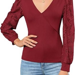 ZAFUL Womens Tops Cross Wrap Deep V Neck Long Sleeve Tops Fall Lace Sleeve Blouse Shirts 2025 Fashion Casual Top