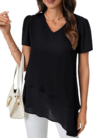 Vrtige Women’s V Neck Layer Blouse Short Sleeve Asymmetrical Top Loose Fit Long Pullover Blouse